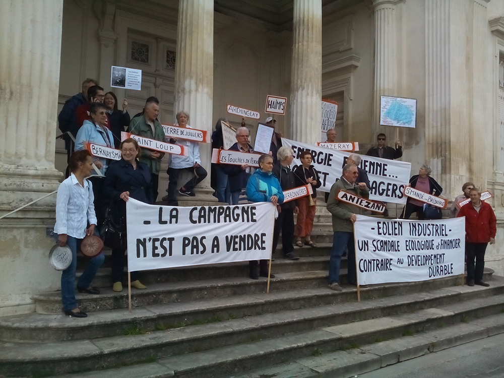Une trentaine d’anti-éolien mobilisés ce matin devant la sous-préfecture de Saint-Jean-d’Angély. (photo Christophe Coriton)