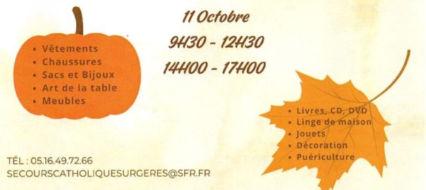 La boutique du Secours catholique organise un grand déballage samedi 11 octobre à Surgères. Rendez-vous rue Théodore Tournat, aux horaires d’ouverture de 9h30 à 12h30 et de 14h à 17h. Sur place,Lire la suite…