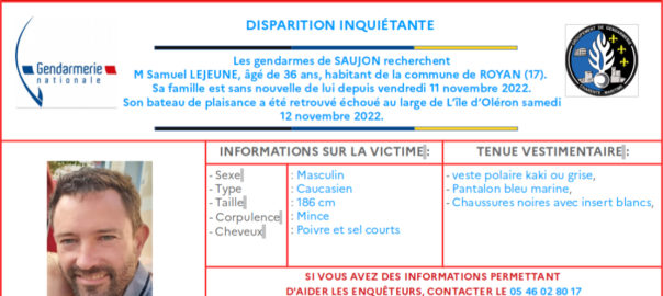 La gendarmerie de Saujon a lancé un appel à témoins après la disparition d’un plaisancier. Samuel Lejeune, un Royannais de 36 ans dont le bateau a été retrouvé échoué sur l’île d’OléronLire la suite…