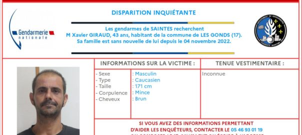 La gendarmerie de Saintes a lancé un appel à témoins après une disparition inquiétante aux Gonds. Xavier Giraud, 43 ans, n’a plus donné signe de vie depuis le 4 novembre dernier. 20Lire la suite…