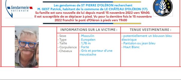 La gendarmerie lance un appel à témoins suite à la disparition inquiétante d’un habitant du Château-d’Oléron. Patrick Gest, 63 ans, n’a plus donné signe de vie depuis hier matin, 10h. Sa familleLire la suite…