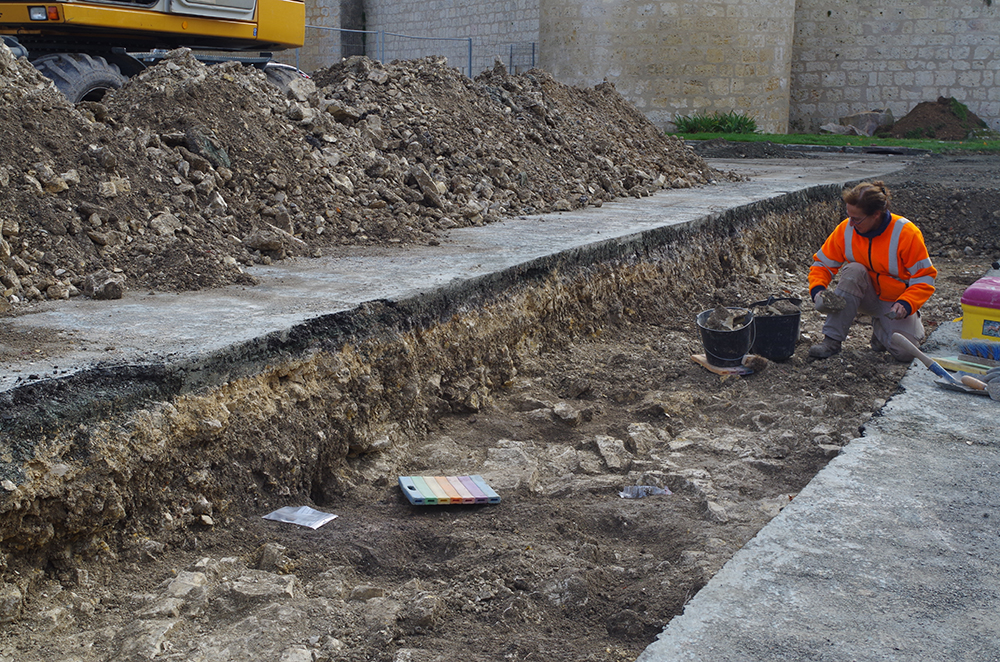 Troisième semaine de fouilles sur le parking du château de Surgères. Les archéologues sont intervenues cette semaine en zone 2, sur l’autre moitié du parking. Trois sondages qui ont permis de confirmer une nouvelle fois la présence de la première douve, mais aussi pour la première fois l’amorce de la deuxième douve. Une occupation médiévale a également été identifiée dans la zone localisée entre ces deux douves suite à la mise au jour de mobilier médiéval probablement du 11e ou 12e siècle. Le point sur les découvertes faites cette semaine avec Catherine Vacher, l’archéologue en charge du diagnostic :