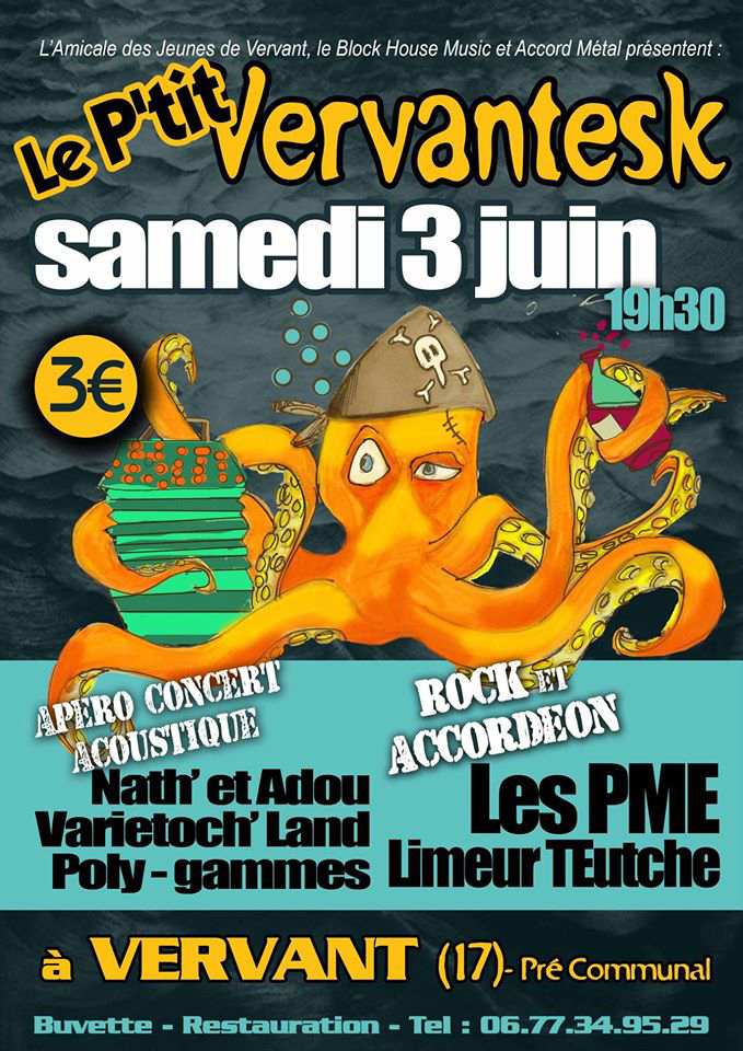 Puis le rock et l’accordéon seront de nouveau à l’honneur avec Les P.M.E (pas mal énervés) qui rappelleront des souvenirs à ceux qui avaient flashé sur Rue d’la soif au Vervantesk 2015, puisque s’y trouvent le chanteur et l’accordéoniste, et enfin les municipaux de Limeur TEutche clôtureront les hostilités. »
