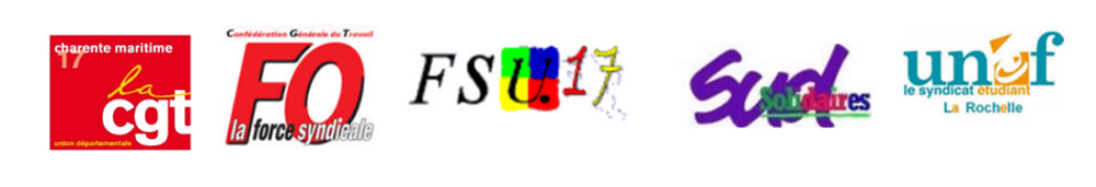 La CGT, Force ouvrière, la FSU, Sud et l’Unef appellent à 4 rassemblements en Charente-Maritime. A 10h sur le parvis de la gare de Royan. Et à 10h30 place de Verdun à La Rochelle, place Colbert à Rochefort et devant le Palais de justice de Saintes.