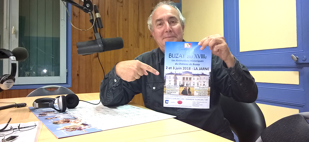 Scène ouverte avec Jean-Christophe Méreau, président de l’association Trac en scène de La Jarne, pour la promotion du spectacle « Buzay au XVIIIe » qui aura lieu du 2 au 3 juin 2018 au château de Buzay de La Jarne.