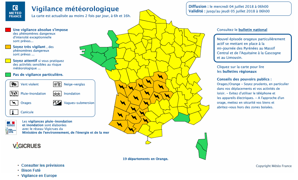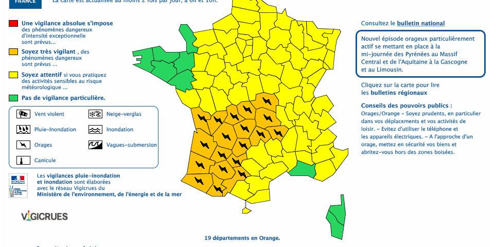 Une activité intense est prévue cet après-midi. Et le phénomène pourrait être violent selon Météo France, qui a émis un bulletin de vigilance pour la période comprise entre 14h et minuit. La dégradation orageuse va débuter sur les départements côtiers de la Nouvelle-Aquitaine et s’étendre rapidement vers l’Est, accompagnée de fortes rafales de vent de 80 à 100km/h, voire 130km/h localement. Mais aussi de chutes de grêle et de fortes pluies.