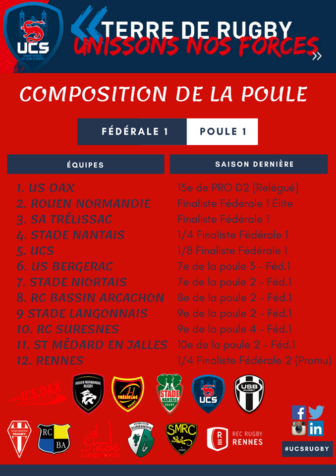 J-6 avant la reprise du championnat de Fédérale 1. L’Union Cognac-Saint-Jean-d’Angély dresse un état des lieux de la composition de sa poule. Avec du lourd, relégué de Pro D2 ou promu de Fédérale 2. Les Charentais vont affronter cette saison : Dax, Rouen, Trélissac, Bergerac, Niort, La Teste, Langon, Suresnes, Saint-Médard-en-Jalles, Rennes et Nantes en ouverture samedi prochain.