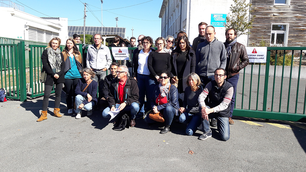 Une trentaine de profs du Lycée du Pays d’Aunis de Surgères se sont mobilisés ce midi. Rassemblés devant les grilles de leur établissement, ils entendaient protester contre la réforme de l’enseignement professionnel qui prévoit de réduire les temps de formation. 11 semaines de cours en moins pour les élèves de Bac pro et 4 à 6 semaines pour ceux de CAP. Le vote est prévu le 3 octobre pour une application dès la rentrée 2019. Marc Havard est professeur de mathématiques et physique. Il ne comprend pas de telles mesures :