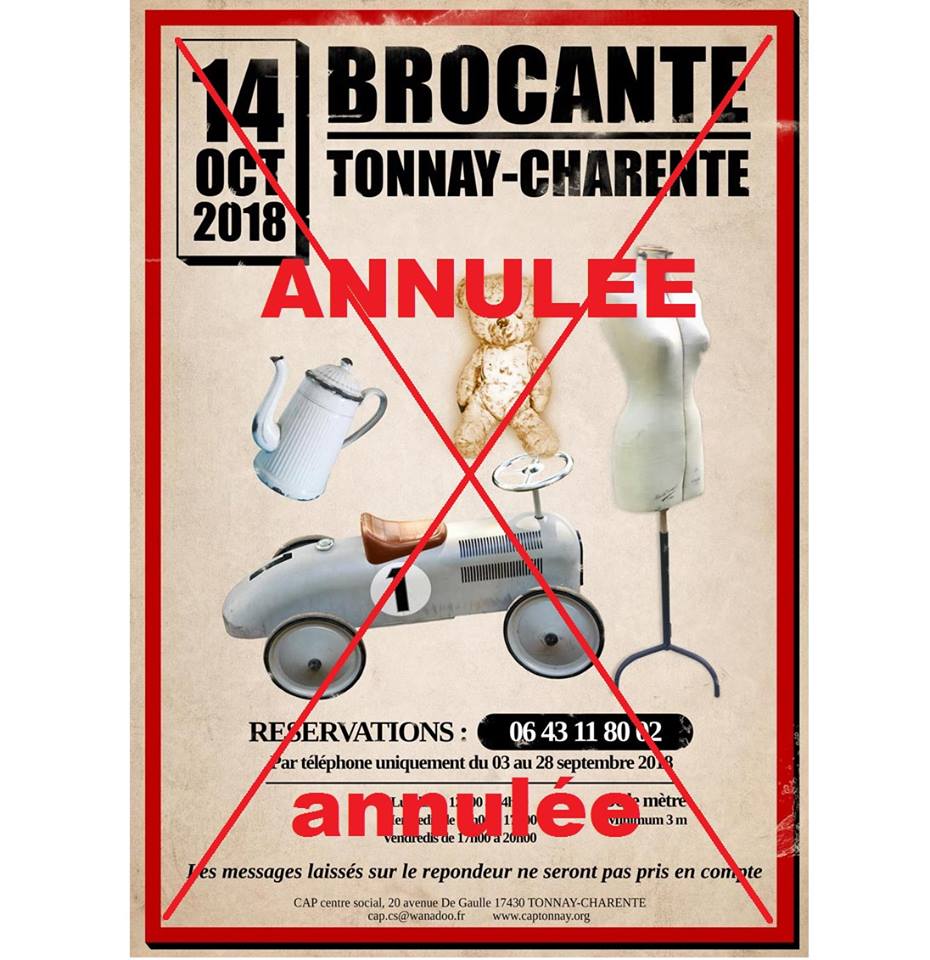C’était un évènement depuis des années. Attirant des milliers de visiteurs sur la commune de Tonnay-Charente. La brocante annuelle prévue ce dimanche n’aura finalement pas lieu. Le CAP centre social, qui organise l’animation, l’a annoncé hier soir. En cause : le manque de moyens humains et de bénévoles pour assurer l’organisation, la sécurité et l’accueil des exposants. Ces derniers ont été contactés et seront tous remboursés. Le maire Eric Authiat accuse le coup.