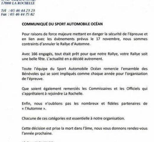 Conséquence du mouvement des gilets jaunes. La 62e édition de cette course automobile, qui devait se dérouler vendredi et samedi prochains dans l’agglomération de La Rochelle et dans la campagne aunisienne, n’aura pas lieu. Les manifestations prévues un peu partout le 17 novembre remettent en cause la sécurité de l’évènement. 166 équipages devaient participer à l’épreuve. Les organisateurs ont donc préféré l’annuler, « la mort dans l’âme ». C’est la première fois qu’une telle décision est prise, huit jours avant son organisation.