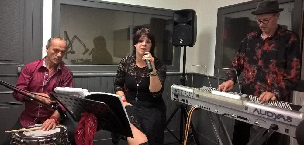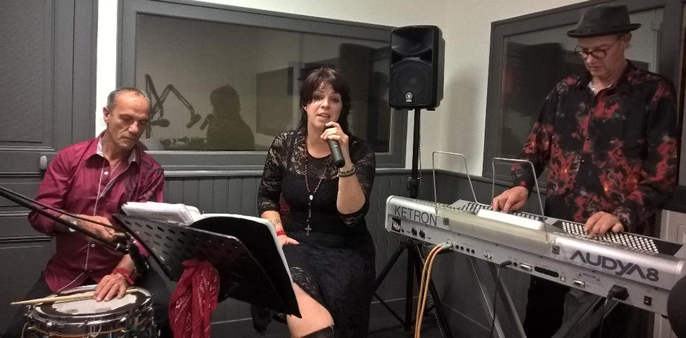 Entourés de L’A Team, le groupe se promène en France entière, autour d’un répertoire fait sur-mesure par les musiciens Thierry ( clavier/ accordéon) et Philippe ( batterie / percussions), et Gilles aux guitares. Laissez vous embarquer par cette voix chaude, puissante, qui sait se faire murmurante quand l’émotion est là, présente et palpable, en toute connexion avec le public.