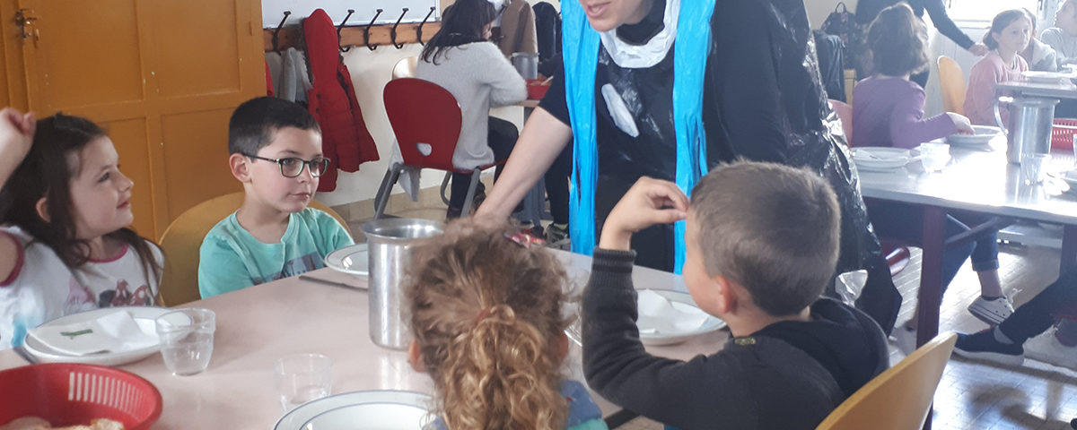 Des actions de sensibilisation sont menées dans les cantines du territoire comme vendredi dernier à l’école élémentaire du Gua. Une poubelle vivante est venue informer les élèves à la pause déjeuner. Eva-Maria Dautry-Autin est la coordinatrice de l’association Terdev, en charge de cette action de prévention :