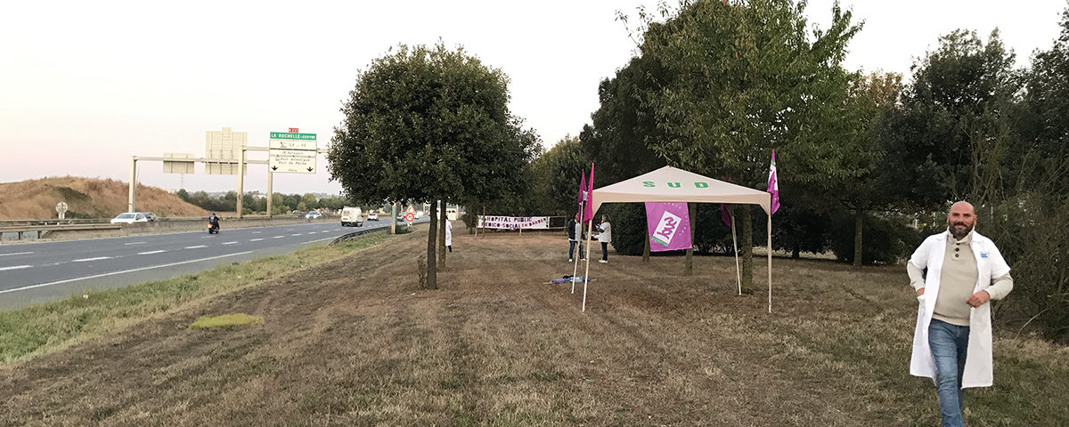 Ils se sont mobilisés hier, à l’appel du syndicat Sud santé sociaux 17. Ils ont installé un « hôpital public de campagne » sur le bord de la rocade de La Rochelle, face à la clinique privée Capio. Une manière de dénoncer le manque de moyens envers l’hôpital public, mais aussi les récentes annonces de la Ministre de la santé Agnès Buzyn et son plan de refondation des urgences hospitalières à 750 millions d’euros. C’est ce que nous dit Christophe Geffré, secrétaire départemental du syndicat Sud :