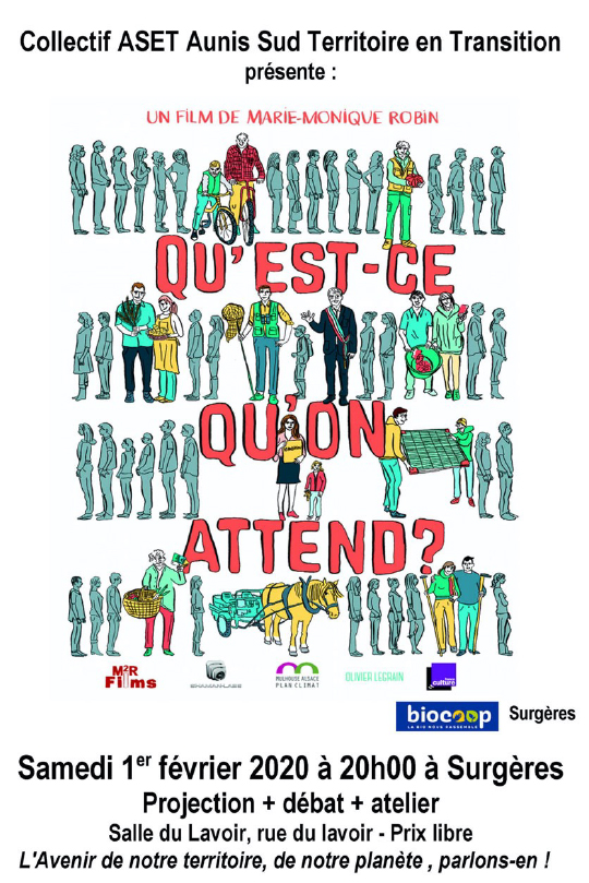 Le collectif Aunis Sud en transition organise demain à Surgères une projection du film « Qu’est-ce qu’on attend ? » de la journaliste Marie-Monique Robin qui raconte comment un petit village d’Alsace s’est lancé dans une démarche de transition, en décidant de réduire son empreinte écologique. C’est à 20h, suivi d’un débat et d’ateliers. L’occasion pour le collectif d’interpeller les candidats aux Municipales qui ont été invités, et de leur remettre une liste de 32 propositions concrètes pour agir en faveur de la transition écologique.