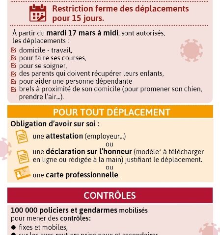 L’heure du confinement a sonné ce midi. Désormais tous les déplacements sont limités en France. Une mesure drastique annoncée hier soir par le chef de l’Etat Emmanuel Macron pour lutter plus efficacement encore contre la propagation du coronavirus. Toute sortie n’est désormais autorisée que pour aller au travail, chez son médecin, pour la garde de ses enfants, faire ses courses, pratiquer une activité physique individuelle ou sortir son chien. Chaque déplacement devra être justifié via une attestation téléchargeable sur le site du Ministère de l’intérieur et sur notre site internet à imprimer ou à recopier sur papier libre. 100 000 policiers et gendarmes seront mobilisés partout en France pour faire respecter ce confinement. La violation de ces règles sera sanctionnée d’une amende de 38 euros qui sera prochainement portée à 135 euros.