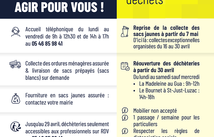 La reprise de la collecte des sacs jaunes dans le Bassin de Marennes. La Régie des déchets de la Communauté de communes annonce que les emballages seront de nouveau ramassés à partir du 7 mai. D’ici là, des collectes exceptionnelles de déstockage continuent d’être organisées dans les communes. Le calendrier est disponible sur le site de la CdC bassin-de-marennes.com