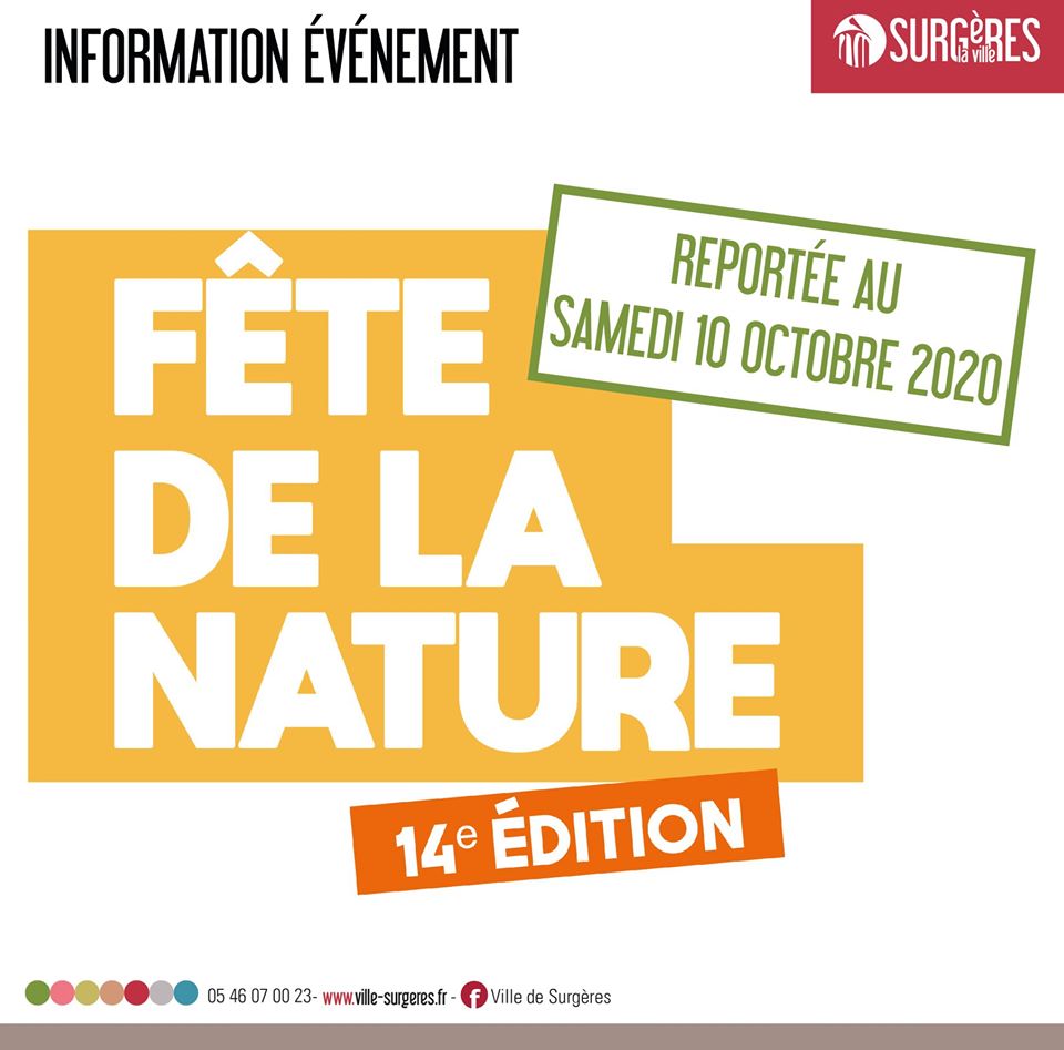 La Fête de la nature à Surgères à son tour reportée. L’évènement prévu fin mai dans le parc du château aura lieu finalement le samedi 10 octobre, en raison de la crise sanitaire. Le programme sera bientôt dévoilé.