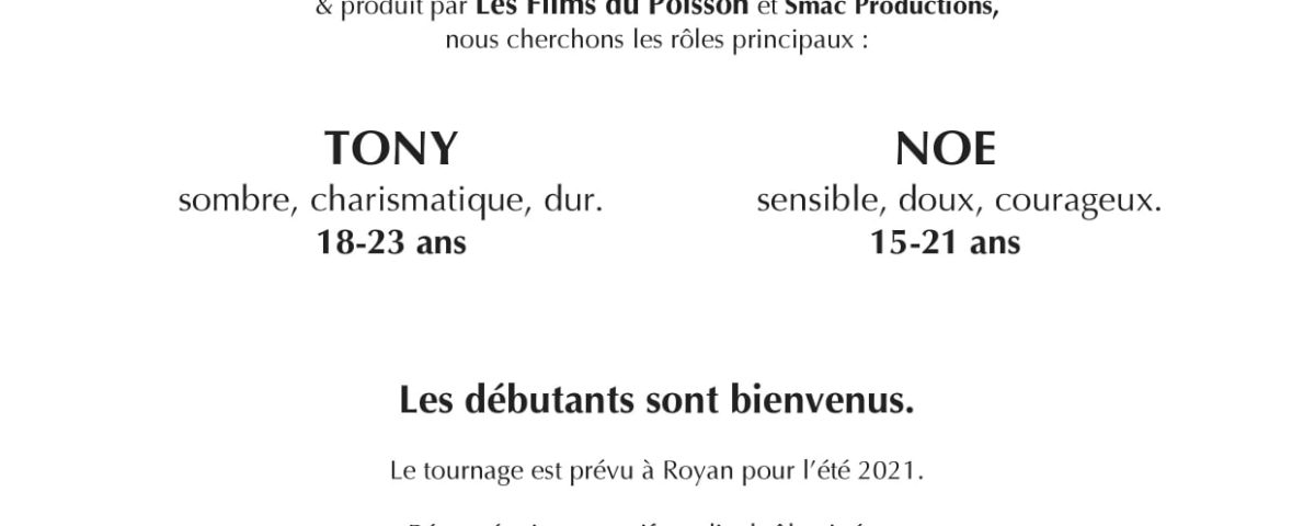 La production Les films du poisson et Smac recherchent deux garçons entre 15 et 23 ans pour les rôles principaux de « Nos cérémonies » de Simon Rieth. Le tournage est prévu pour l’été 2021. Les candidatures avec photos et coordonnées sont à envoyer par mail à castingnosceremonies@gmail.com. Les débutants sont les bienvenus.