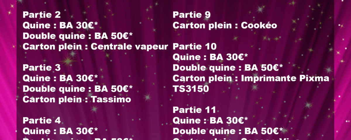 Il ne vous reste plus que deux jours pour réserver vos cartons à la demande (dernier délai dimanche à 13h). Ensuite, il sera toujours possible de participer (date limite d’inscription le 21 mars à midi), mais vous ne pourrez plus choisir vos cartons. Ils seront générés automatiquement par planche de 6 ou 12 avec les 90 numéros.