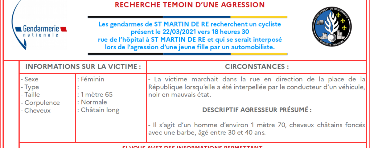 La gendarmerie lance un appel à témoins après l’agression d’une jeune fille le 22 mars dernier sur l’île de Ré. Elle est à la recherche d’un cycliste qui était présent ce jour-là vers 18h30 rue de l’hôpital à Saint-Martin-de-Ré. Cet homme aurait été témoin de l’agression et se serait interposé. L’agresseur est un homme âgé entre 30 et 40 ans, barbu, d’environ 1,70m et les cheveux châtains foncés. Il roulait à bord d’un véhicule noir en mauvais état. Toute information peut être communiquée au 05 46 09 21 17.