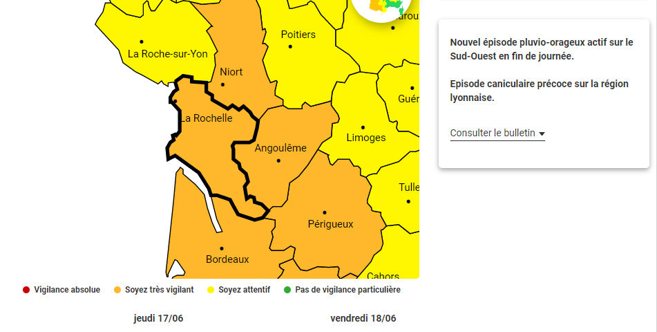 La Charente-Maritime est de nouveau placée en vigilance orange pour le risque d’orages, mais aussi et surtout en raison du risque pluie-inondation. Le temps va rester encore assez tumultueux ce jeudi dans notre département, avec la présence d’orages localisés, accompagnés d’un risque de chute de grêle en fin de journée. Le temps est gris et humide, avec de fortes précipitations cet après-midi et en soirée. Ça devrait se calmer demain vendredi, avant le retour d’un ciel tourmenté samedi et dimanche. Côté mercure, ça redevient enfin plus respirable avec une moyenne de 20° ce matin. Ça ne devrait pas dépasser les 23° cet après-midi sur le littoral et 24° dans les terres. Le vent va se renforcer avec des rafales à 80km/h cet après-midi.