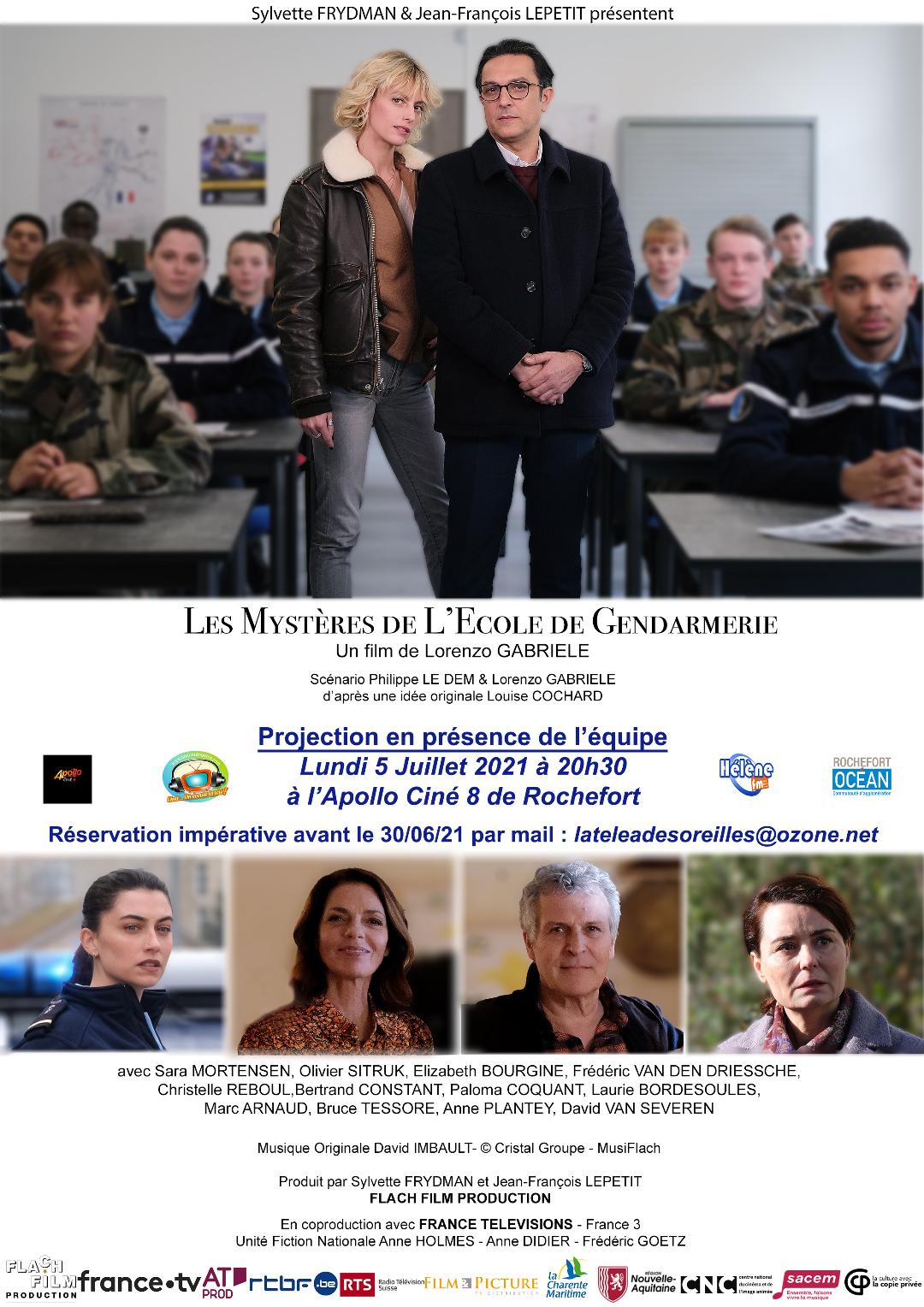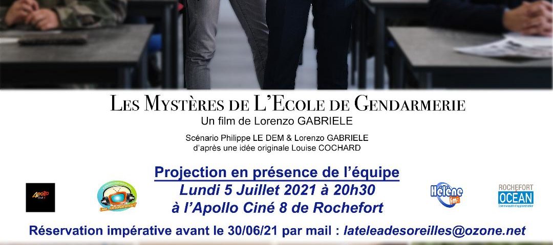 Avant-première ce soir à Rochefort du téléfilm « Les mystères de l’école de gendarmerie ». La suite des « Mystères du bois galant » qui avait déjà été tourné à Rochefort et ses alentours. Avec toujours à la réalisation Lorenzo Gabriele. Et les même comédiens Sara Mortensen et Olivier Struk, pour les principaux. La projection est prévue à 20h30 à l’Apollo ciné 8, en présence de l’équipe du téléfilm qui sera prochainement diffusé sur France 3. Emission spéciale ce soir de 18h à 19h sur Hélène FM et Vogue radio avec Alain Jeanne et ses invités, depuis le cinéma de Rochefort.
