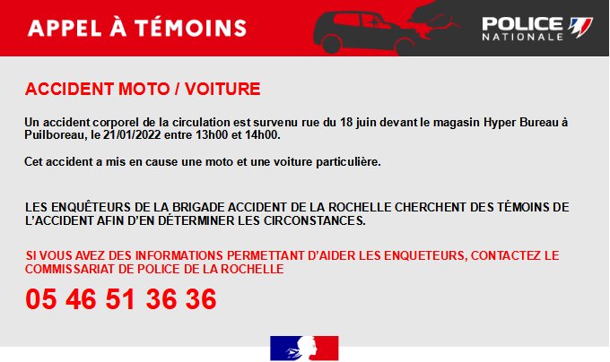 La police de La Rochelle lance un appel à témoins après un grave accident de moto survenu vendredi après-midi à Puilboreau. Entre 13h et 14h, le véhicule est entré en collision avec une voiture rue du 18 juin, devant le magasin Hyper Bureau. Le motard a été grièvement blessé. Une enquête a été ouverte. Si vous avez été témoin du choc ou si vous avez des informations à communiquer relatives aux circonstances de cet accident, vous pouvez contacter le commissariat de La Rochelle au 05 46 51 36 36.