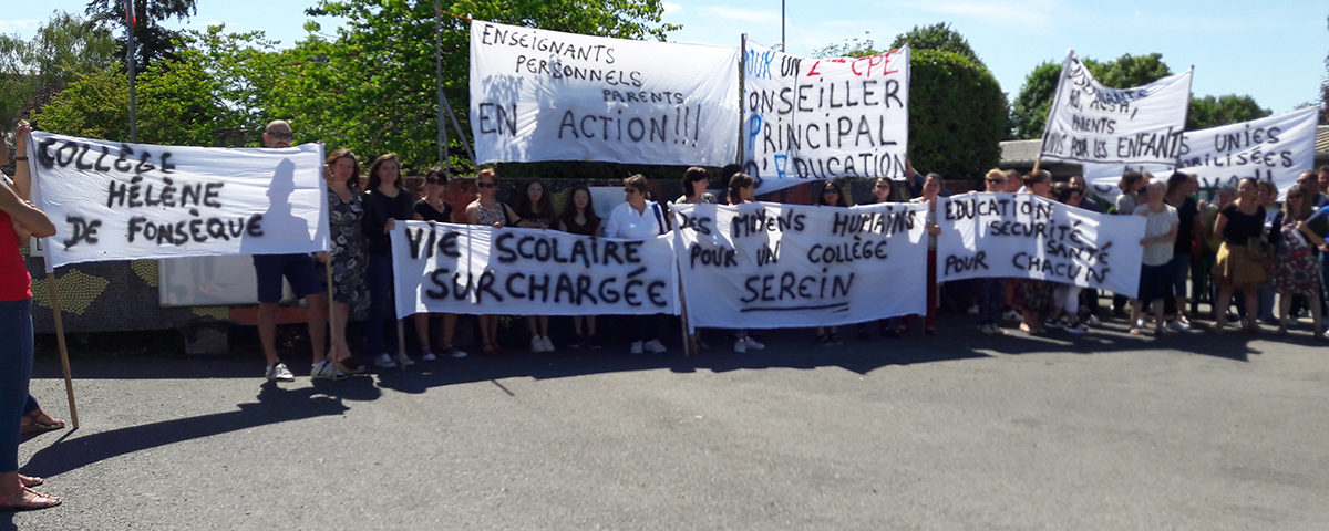 Journée blanche ce jeudi au collège Hélène de Fonsèque de Surgères. Une cinquantaine de profs se sont mis en grève pour réclamer la présence d’un 2e conseiller principal d’éducation. La quasi-totalité des enseignants de l’établissement a cessé le travail, ainsi que l’ensemble des surveillants. Après une manifestation à la mi-journée devant les grilles de la cité scolaire qui regroupe un collège et deux lycées pour plus d’un millier d’élèves, le cortège a défilé en centre-ville pour exprimer son mécontentement face à l’inertie du rectorat et du ministère, comme le souligne Céline Gouttefangeas, professeur de Lettres, et représentante du personnel et du syndicat Snes :