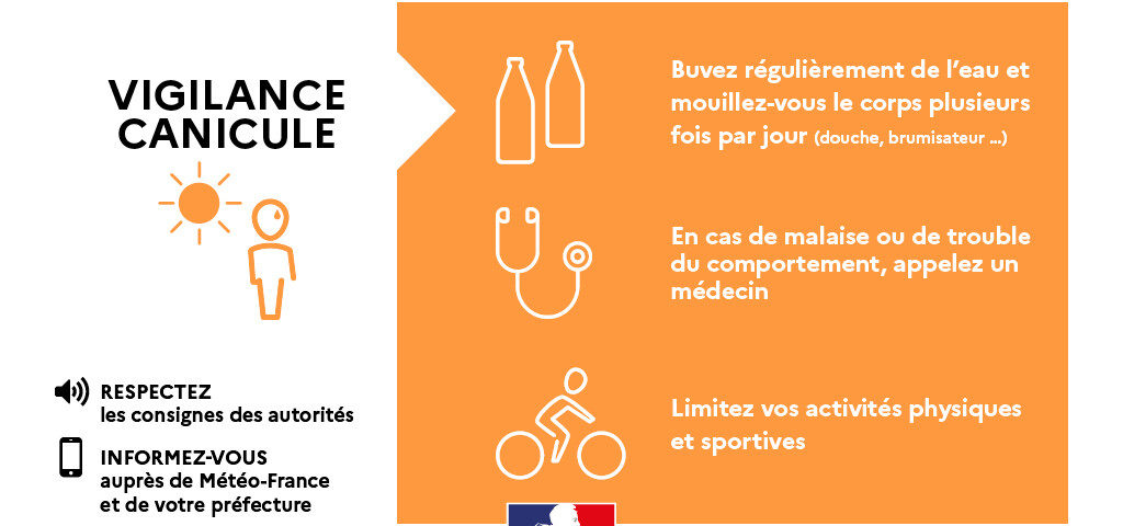 La Charente-Maritime a été placée en vigilance orange pour la canicule. Les très fortes chaleurs vont persister ces prochains jours, et s’intensifier jusqu’à samedi. Des records de températures sont attendus, avec des valeurs élevées, de jour comme de nuit, frôlant les 40° demain et samedi. La préfecture de la Charente-Maritime a activé le passage au niveau 3 du plan canicule. Elle invite à la vigilance concernant les personnes fragiles ou isolées, et donne des conseils de comportement à adopter, comme maintenir son logement au frais, aérer la nuit, boire régulièrement de l’eau, éviter l’alcool ou encore de sortir aux heures les plus chaudes entre 11h et 17h. En cas de malaise ou de troubles du comportement, il faut contacter son médecin ou composer le 15 ou le 18.