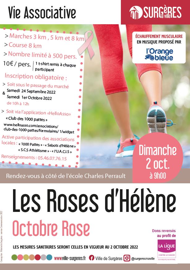 C’est ce samedi que débute Octobre rose, le mois de prévention contre le cancer du sein. Une maladie qui cause la mort de près de 12 000 femmes chaque année en France. C’est le plus répandu des cancers féminins avec 54 000 nouveaux cas tous les ans. D’où une forte mobilisation partout en France pour encourager les femmes à se faire dépister, avec de très nombreuses manifestations. En Charente-Maritime, la Ville de Surgères organise dimanche prochain la 3e édition des Roses d’Hélène. Un défi sportif que nous présente Sylvie Plaire, adjointe au maire en charge des sports :