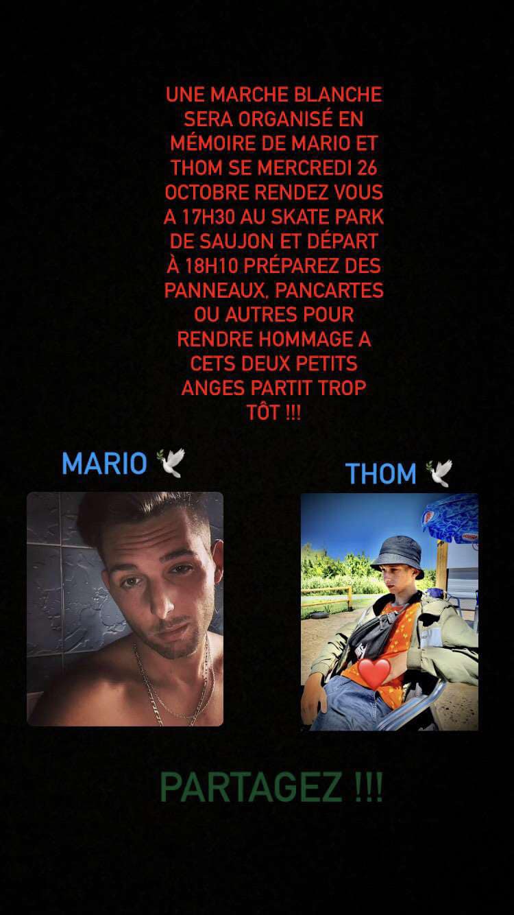 Une marche blanche est organisée ce soir à Saujon en hommage à Mario et Thom, ces deux jeunes de 15 et 20 ans, issus de la communauté des gens du voyage, qui ont été mortellement percutés par un véhicule utilitaire samedi dernier au Gua. Les proches des deux victimes ont donné rendez-vous à partir de 17h30 au skate-park, avant un départ à 18h10. Pour rappel, le conducteur de 29 ans a été mis en examen lundi pour homicide involontaire par maladresse. Il a été placé sous contrôle judiciaire.