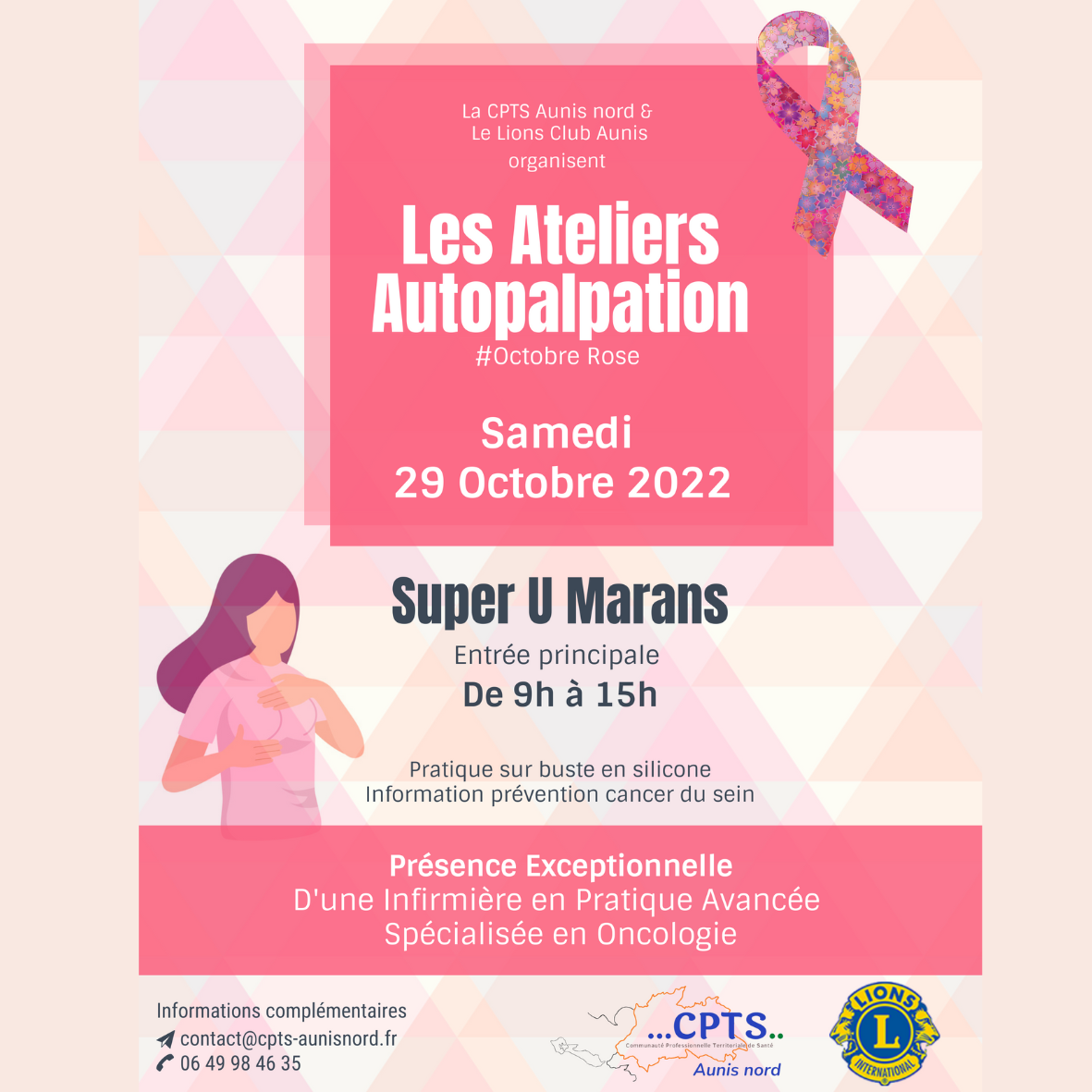 La CPTS Aunis Nord se veut être à l’écoute des problématiques de la population. A ce titre, elle vient de lancer son Observatoire participatif de la santé pour pouvoir échanger avec les habitants. Un rendez-vous est prévu le 8 novembre à 18h à la salle polyvalente d’Andilly. En outre, elle propose actuellement des actions sur le territoire, comme des ateliers d’autopalpation demain de 9h à 15h au Super U de Marans, dans le cadre d’Octobre rose, puis le 5 novembre une après-midi bien-être à Marsilly.