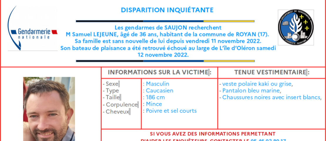 La gendarmerie de Saujon a lancé un appel à témoins après la disparition d’un plaisancier. Samuel Lejeune, un Royannais de 36 ans dont le bateau a été retrouvé échoué sur l’île d’Oléron le 12 novembre dernier. Sa famille est sans nouvelle de lui depuis la veille où il avait quitté le port de Ribérou à Saujon pour une sortie en mer. Malgré les recherches entreprises pour le retrouver, Samuel Lejeune demeure introuvable. Il mesure 1,86m, est de corpulence mince, a les cheveux poivre et sel coupés courts. Le jour de sa disparition, il était vêtu d’une veste polaire kaki ou grise, d’un pantalon bleu marine et portait des chaussures noires avec inserts blancs. Toute personne ayant des informations peut contacter la brigade de gendarmerie de Saujon au 05 46 02 80 17.