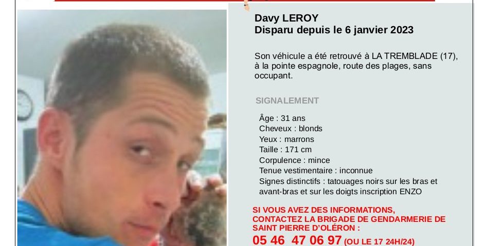 Un appel à témoins a été lancé après la disparition inquiétante d’un homme de 31 ans à La Tremblade. Davy Leroy n’a plus donné signe de vie depuis vendredi dernier. Son véhicule a été retrouvé dans la commune, à la pointe espagnole, route des plages, vide de tout occupant. Le trentenaire mesure 1,71m, est de corpulence mince, a les cheveux blonds et les yeux marrons. Il porte des tatouages noirs sur les bras et les avant-bras. Et le prénom Enzo est tatoué sur ses doigts. On ignore ce qu’il portait comme vêtements le jour de sa disparition. Si vous avez des informations pouvant aider les enquêteurs, vous pouvez contacter la brigade de gendarmerie de Saint-Pierre-d’Oléron au 05 46 47 06 97.