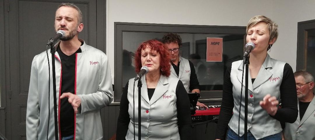Crée en 2012, le groupe HOPE à débuté avec une configuration plus « minimaliste » que celle actuellement. En effet, la formation musicale était initialement composée de 3 chanteurs (ce que nous nommons affectueusement le « noyau dur ») et d’un guitariste (Patrick Papineau, ancien coordinateur de la Puce à l’oreille et du Chœur Gospel de La Rochelle(17), qui est d’ailleurs à l’initiative du groupe, qui se nommait à l’époque « Hope Quartet »). Plus tard, le groupe s’est modifié après le départ du 2éme guitariste pour devenir ce qu’il est aujourd’hui : les 3 chanteurs « principaux » : Nicolas Louradour (Ténor); Adrienne Shambert (Soprano) ; Sandrine Banéat (Alto) et 3 musiciens : Samuel Perrot (Clavier) ; Alan Todd (Guitare); Hubert Ravard (Drums et Chant) ainsi que les oreilles et les yeux exercés de Wilfried Texier qui est notre technicien son et lumières.