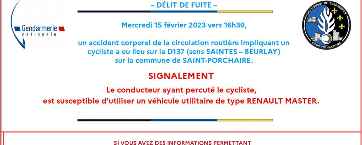 La gendarmerie de la Charente-Maritime lance un appel à témoins après un délit de fuite suite à un accident de la route survenu mercredi dernier. Ce jour-là, un cycliste a été percuté par un véhicule utilitaire qui ne s’est pas arrêté. Les faits se sont déroulés vers 16h30 sur la RD 137, dans le sens Saintes-Beurlay. Les enquêteurs recherchent des témoins pour identifier le conducteur qui roulait à bord d’un véhicule de type Renault Master. Si vous avez des informations pouvant faire avancer l’enquête, vous pouvez contacter la brigade de gendarmerie de Saint-Porchaire au 05 46 95 60 03 ou en composant le 17.