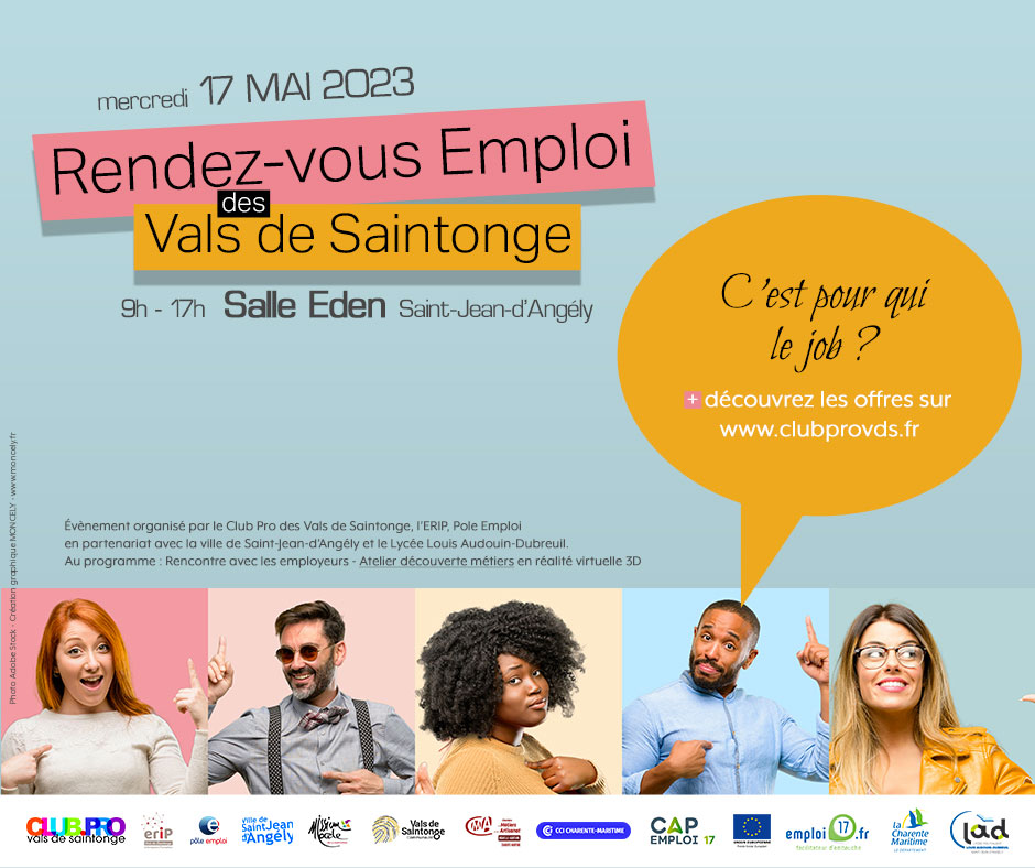 Le Rendez-vous de l’emploi des Vals de Saintonge, c’est toute cette journée de 9h à 17h à la salle de l’Éden à Saint-Jean-d’Angély. Pensez à vous munir de CV.
