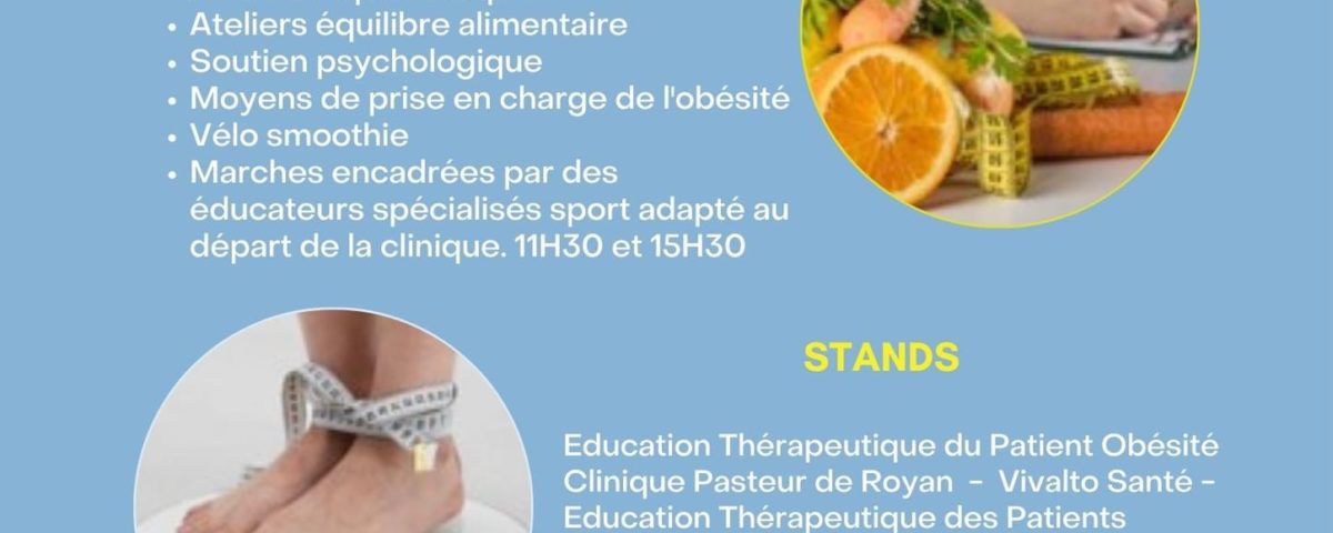 Deux temps forts sont prévus ce mardi à la Clinique Pasteur de Royan. Des stands et des animations sont proposés de 10h à 17h30, avec des activités de sport adapté et d’équilibre alimentaire. Ainsi que deux marches à 11h30 et 15h30. Puis à 18h30, une conférence est organisée à la salle Jean-Gabin sur le thème « Obésité et surpoids : la prise en charge en 2023 », animée par différents intervenants, chirurgiens et spécialistes. Cette journée est gratuite et ouverte à tous.