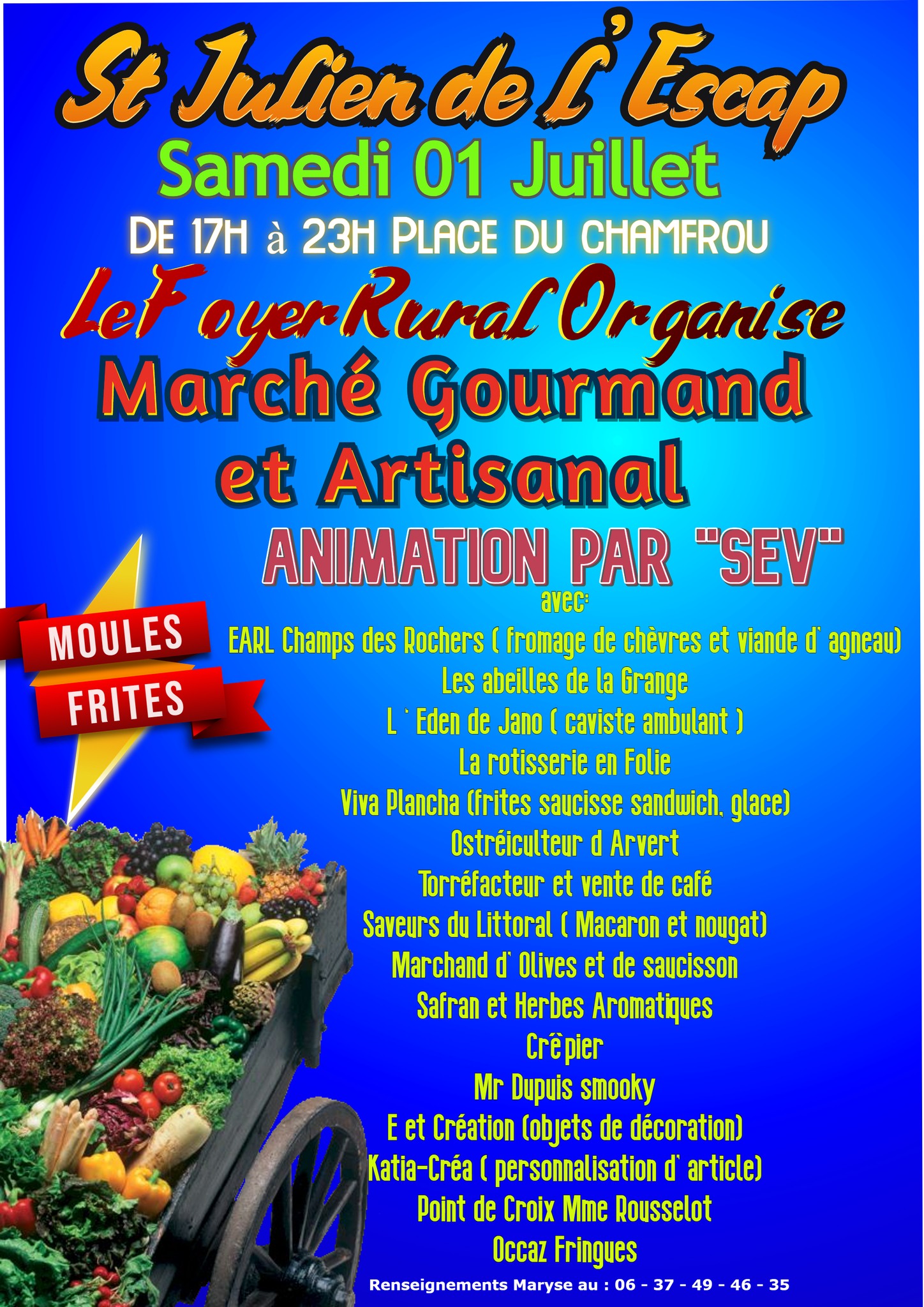 À Saint-Julien-de-L’Escap, le Foyer rural organise la 2éme édition de son marché gourmand et artisanal ce samedi 1er juillet, place du Chamfrou, de 17h à 23h. Vous aurez la possibilité de manger sur place grâce aux tables et bancs installés pour l’occasion. Vous pourrez retrouver divers commerçants et ainsi découvrir leurs produits. Pensez à apporter vos couverts. Renseignements au 06 37 49 46 35.
