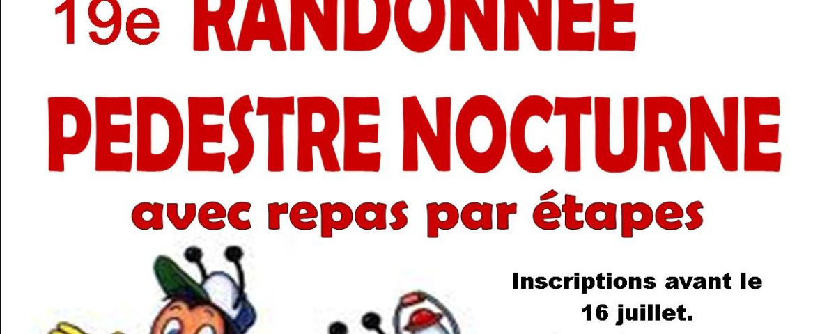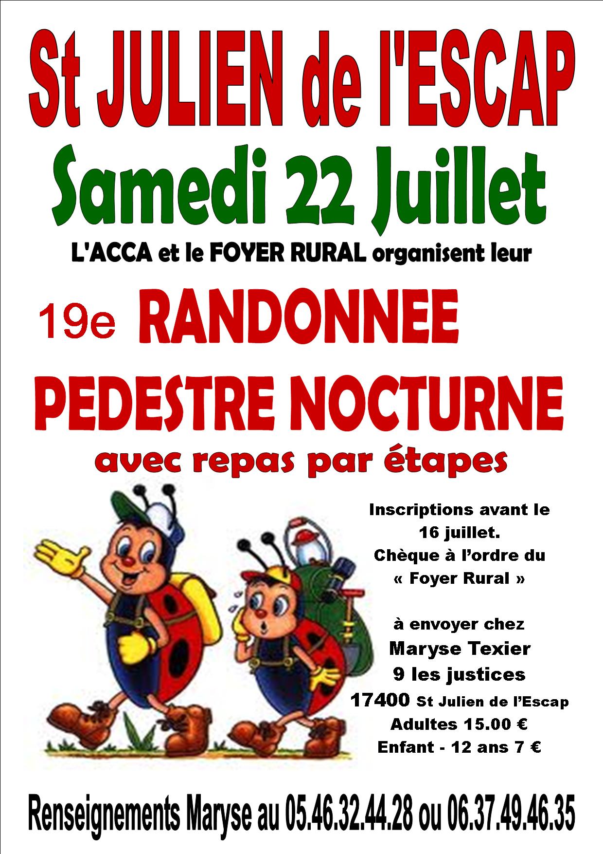 À Saint-Julien-de-L’Escap, l’ACCA et le Foyer rural organisent leur 19éme randonnée pédestre nocturne avec repas par étapes samedi 22 juillet. Tarifs : adultes 15€ et 7€ pour les enfants de moins de 12 ans. Inscriptions, avant le 16 juillet, en envoyant un chèque à l’ordre du « Foyer Rural » chez Maryse Texier, 9 les justices 17400 Saint-Julien-de-L’Escap. Renseignements au 05 46 32 44 28 ou au 06 37 49 46 35.