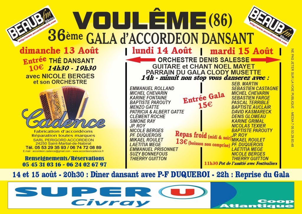 À Voulême, dans la Vienne, Nouvelle-Aquitaine Accordéon organise son 36ème gala les 13, 14 et 15 août. Dimanche 13 août : thé dansant de 14h30 à 19h30 à 10€ avec Nicole Bergès et son orchestre. Lundi 14 et mardi 15 août, de 14h à minuit non-stop, le gala sera animé par l’orchestre de Denis Salesse, accompagné de 17 accordéonistes. Noël Mayet sera au chant et à la guitare, et Clody musette parrain du gala. Repas froid, midi et soir, à 13€ hors boissons. Entrée gala 15€. Les 14 et 15 août dîner dansant avec Pierre-François Duqueyrois, reprise du gala à 22h. Renseignements et réservations au 05 45 31 03 16 ou au 06 24 02 67 97. Emplacement gratuit camping-cars et caravanes.