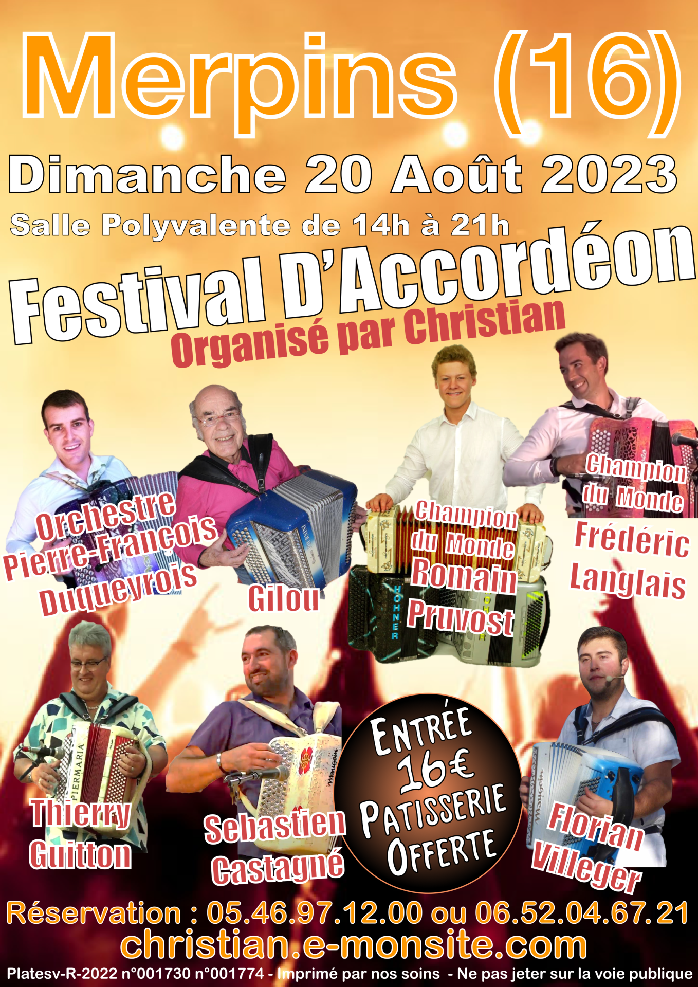 À Merpins, un festival d’accordéon est organisé par Christian ce dimanche 20 août, de 14h à 21h. Il sera animé par l’orchestre de Pierre-François Duqueyrois avec les accordéonistes Frédéric Langlais et Romain Pruvost, champions du monde, Thierry Guitton, Sébastien Castagné, Romain Villeger et Gilou en invité vedette. L’entrée est à 16€ avec une pâtisserie offerte. Pour les renseignements et les réservations, vous pouvez contacter le 05 46 97 12 00 ou le 06 52 04 67 21 et sur christian.e-monsite.com.