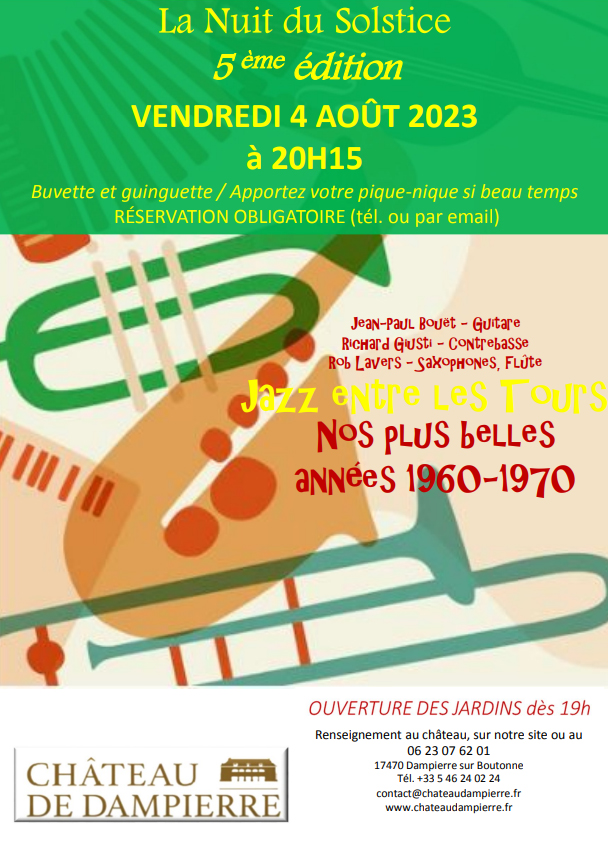 Nuit du solstice, 5è édition : rendez-vous pour un concert de jazz années 60-70 ce vendredi 4 août au château de Dampierre-sur-Boutonne, à 20h15. Possibilité de pique-niquer dans les jardins dès 19h. Buvette sur place. Réservation obligatoire au 05 46 24 02 24 ou par mail à contact@chateaudampierre.fr. Renseignements et tarifs sur châteaudampierre.fr et sur Facebook.