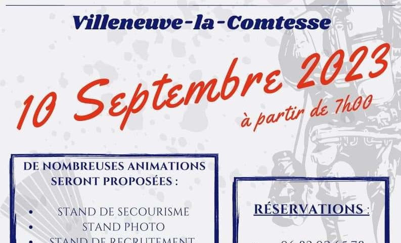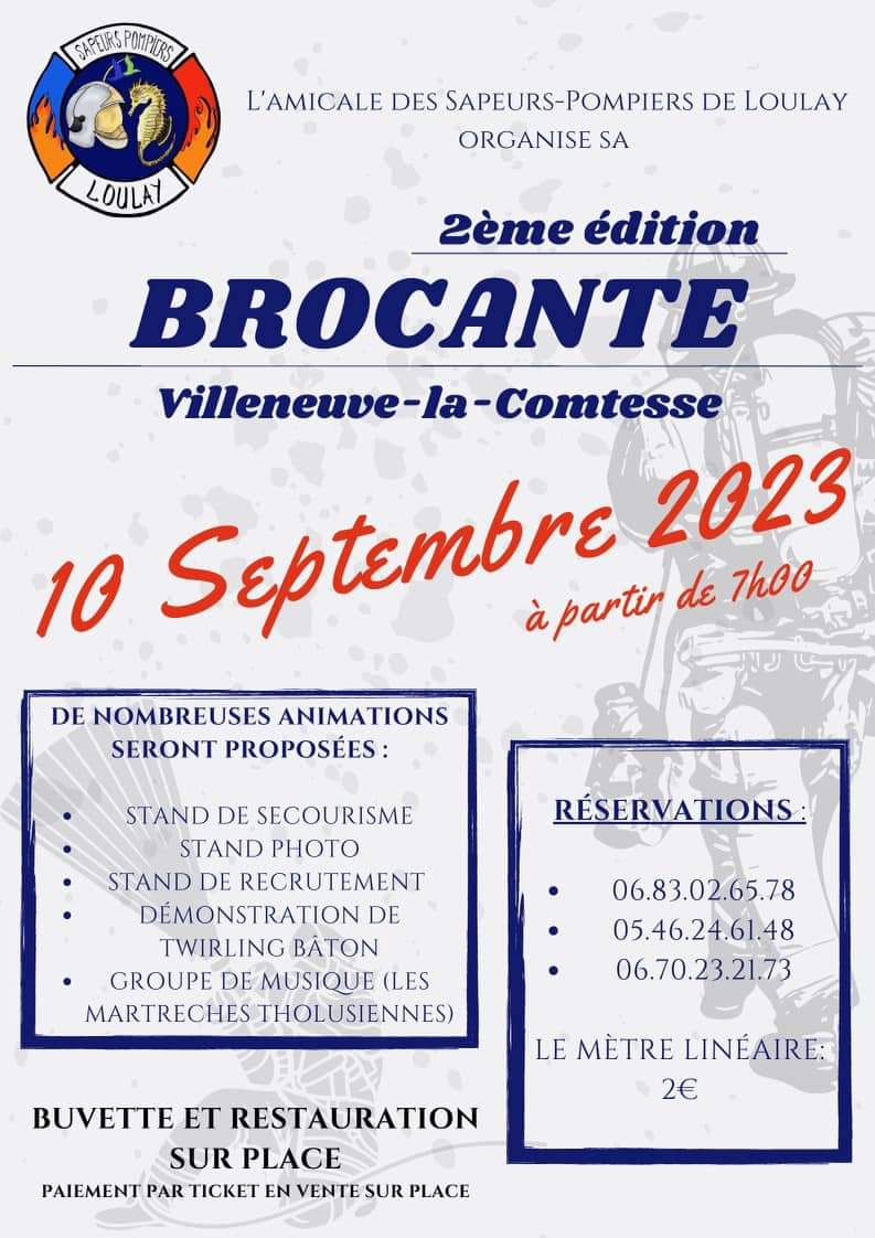 À Villeneuve-la-Comtesse, l’Amicale des sapeurs-pompiers de Loulay organise sa 2ème brocante le dimanche 10 septembre, à partir de 7h. 2€ le mètre linéaire. Buvette et restauration sur place. De nombreuses animations seront proposées : stand de secourisme, de photo et de recrutement ; démonstration de twirling bâton et du groupe de musique Les Martrêches Tholusiennes. Réservation au 05 46 24 61 48 ou 06 70 23 21 73.