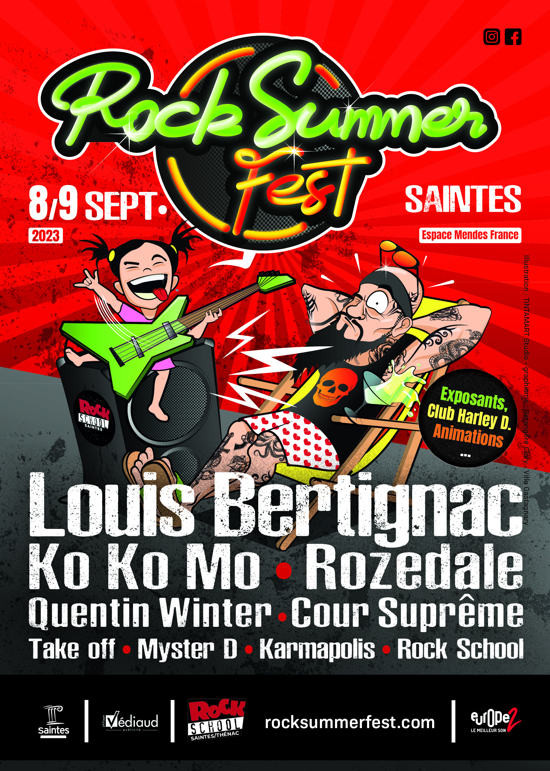 Ne manquez pas le Rock Summer Fest les 8 et 9 septembre prochains à Saintes. Avec sur scène : Louis Bertignac, Rozedale et Ko Ko Mo en tête d’affiche ainsi que Quentin Winter, Cour suprême, Take off, Myster D, Karmapolis et Rock School. Rendez-vous à l’espace Mendès-France. Sur place : village d’exposants, animation rodéo mécanique, club Harley Davidson. Informations sur rocksummerfest.com.