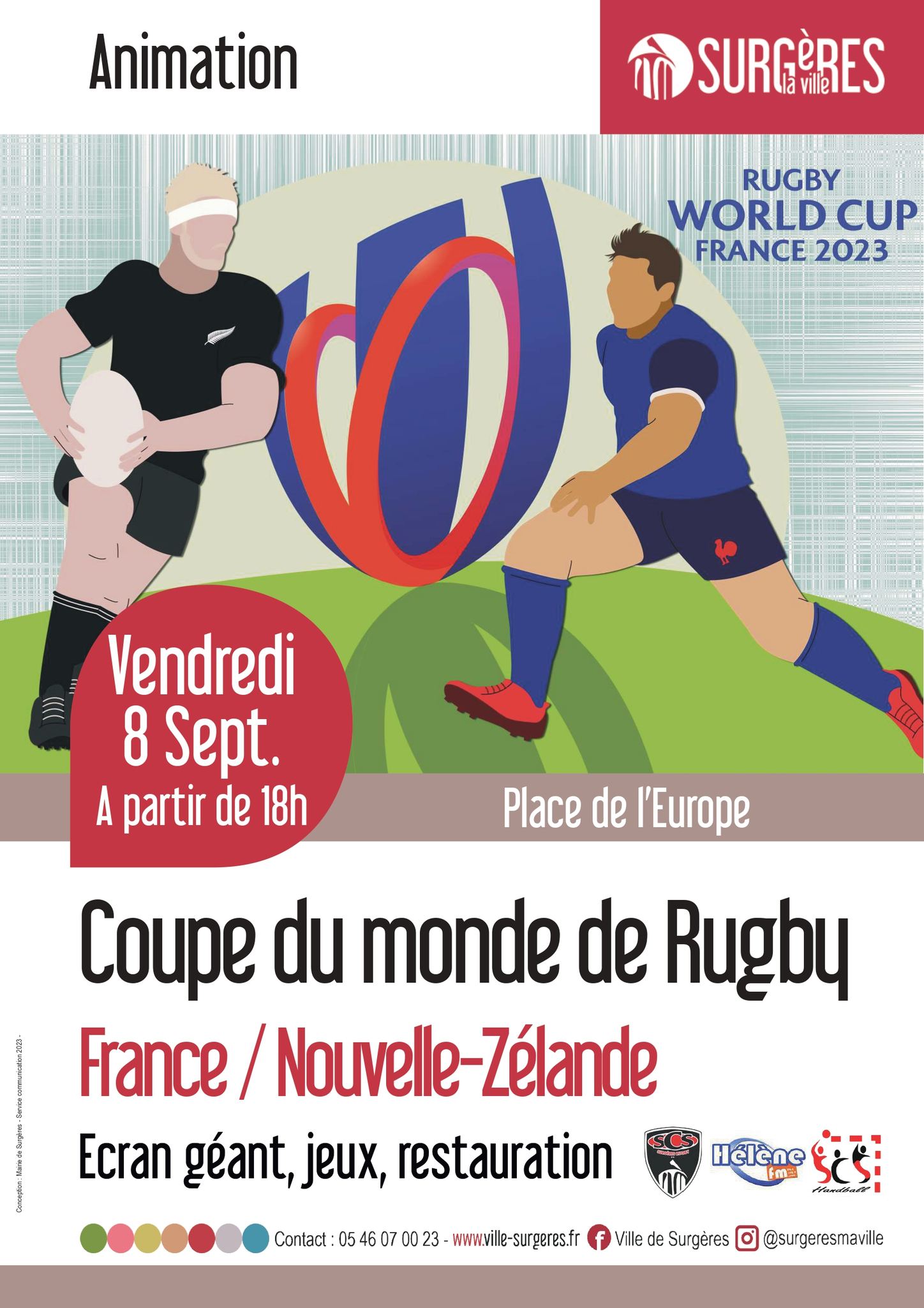 La Ville de Surgères retransmettra le match d’ouverture de la Coupe du monde. En partenariat avec le SCS rugby, le SCS handball et votre radio Hélène FM, elle va installer un écran géant place de l’Europe, en centre-ville, pour la diffusion le 8 septembre du match France/Nouvelle-Zélande. Des jeux seront proposés aux enfants. Un point buvette et restauration sera à la disposition du public. Rendez-vous dès 18h.