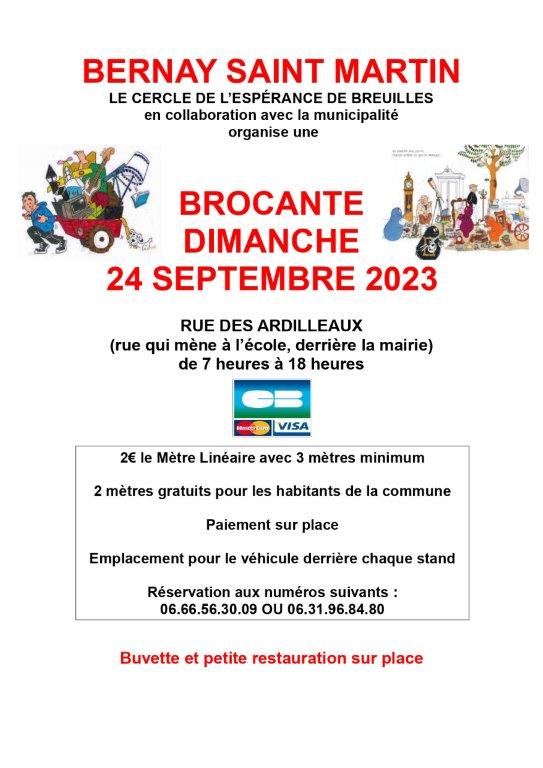 À Bernay-Saint-Martin, le Cercle de l’espérance, en collaboration avec la municipalité, organise une brocante le dimanche 24 septembre, rue des Ardilleaux, derrière la mairie, de 7h à 18h. 2€ le mètre linéaire avec 3 mètres minimum. 2 mètres gratuits pour les habitants de la commune. Emplacement pour le véhicule derrière chaque stand. Paiement sur place. Carte bancaire acceptée. Réservations au 06 66 56 30 09 ou au 06 31 96 84 80. Buvette et petite restauration sur place.