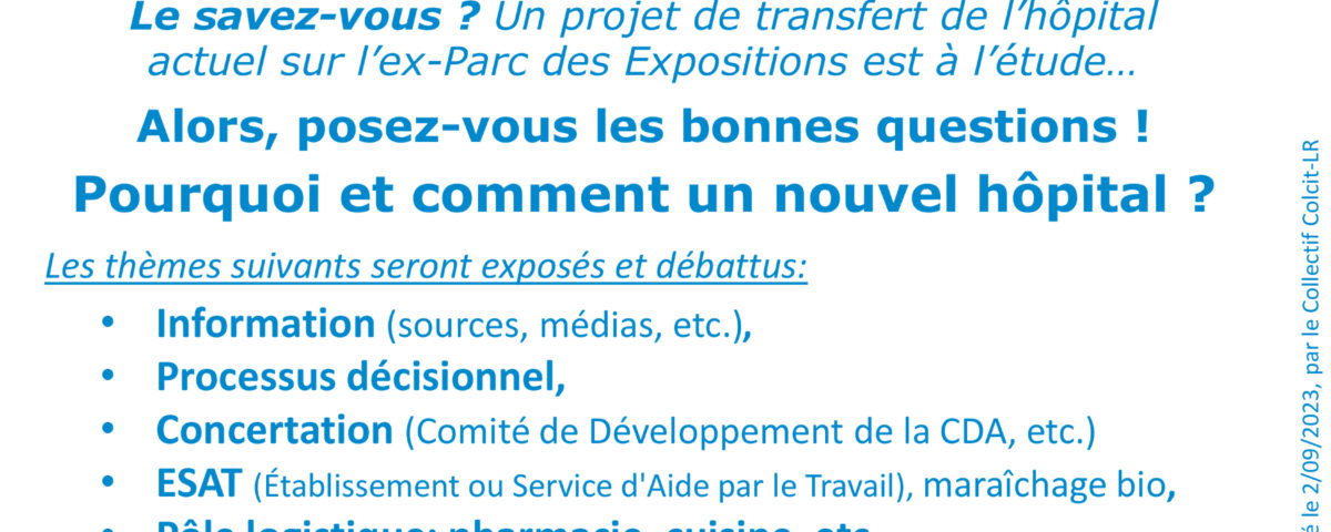 Le transfert et l’aménagement du futur hôpital de La Rochelle au Parc des expositions en question ce soir. Une réunion publique est organisée à l’initiative du collectif citoyen Colcit-LR. Elle a pour thème : « quel hôpital à La Rochelle pour demain ? ». Alors que les enjeux sont importants autant que les interrogations sont nombreuses, notamment sur le coût qui serait passé de 200 à 750 millions d’euros, les réponses manquent, selon Jean Hesbert du collectif :
