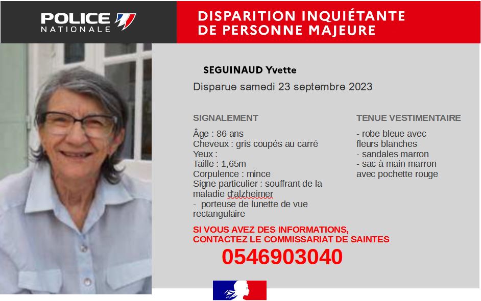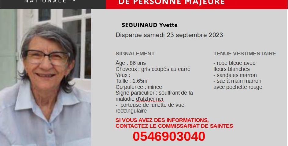 La police de Saintes a lancé un appel à témoins hier après la disparition inquiétante d’une femme de 86 ans. Yvette Séguinaud a quitté son domicile samedi, et depuis elle reste introuvable. Elle souffre de la maladie d’Alzheimer. Elle est mince, mesure 1,65m, a les cheveux gris coupés au carré. Elle porte des lunettes. Le jour de sa disparition, elle était vêtue d’une robe bleue à fleurs blanches, de sandales marron et d’un sac à main marron avec une pochette rouge. Si vous avez des informations, vous pouvez contacter le 05 46 90 30 40.