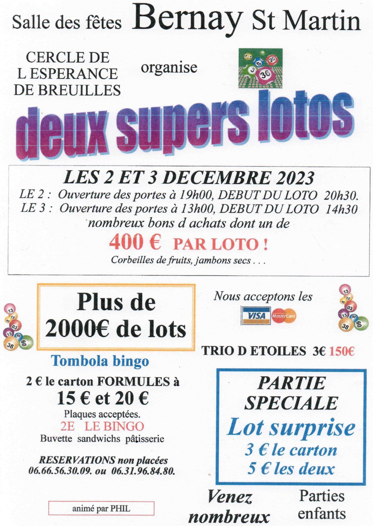 L’association Le Cercle de l’espérance de Breuilles organise deux lotos samedi 2 décembre à 20h30, et dimanche 3 décembre à 14h30, à la salle des fêtes de Bernay-Saint-Martin. Plus de 2000€ de lots et bons d’achat dont un de 400€ par loto, des corbeilles de fruits, des jambons secs. Partie enfant. Animé par Phil. 2€ le carton et formules à 15 et 20€. Plaques acceptées. Tombola et bingo à 2€. Partie spéciale, pour un lot surprise, à 3€ le carton et 5€ les 2. Trio d’étoiles à 3€ pour 150€. Réservations non placées au 06 66 56 30 09 ou au 06 31 96 84 80. Sur place buvette, sandwichs et pâtisserie. Ouverture des portes le samedi à 19h et le dimanche à 13h. Carte bancaire acceptée.